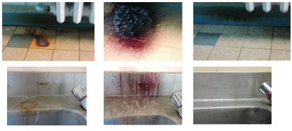 En présence d’oxydes de Fer, de taches de rouille, l’apparition d’une coloration brun-rouge sur les surfaces indique l’action de dérouillage.