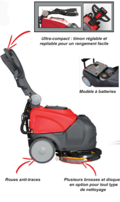 L’autolaveuse D35 est une machine ergonomique et compacte qui est idéale dans les endroit encombrés. Elle est maniable sans effort, elle vous surprendra par sa facilité d’utilisation. Cette autolaveuse est livrée avec une brosse nylon (batteries et chargeurs pour le modèle de batterie)