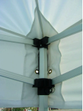 Cet abri est livré avec son kit de haubanage et un sac de transport avec pochette pour ranger les accessoires. Le toit est constitué d’une toile PVC face intérieure 300 g / m² et la tension du toit se fait par velcro avec renfort d’angles de couleur blanche.