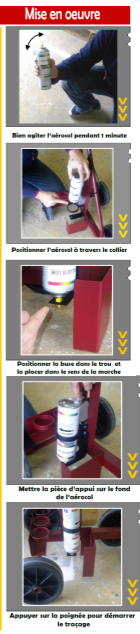 Notre machine de traçage est destinée à tracer des lignes au sol de 4 à 10 cm en utilisant des aérosols de 500 ml net ou 750 ml net. Son châssis, très résistant permet de réaliser des lignes bien rectilignes.