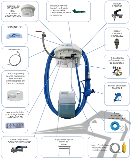 Cette centrale de dilution et désinfection 1 produit est équipée d’un support bidon inox de 5 l, d’un pistolet anti-chocs en plastique, d’une vanne double clapets NF de protection sanitaire et d’un tuyau easy clean de 15 m.
